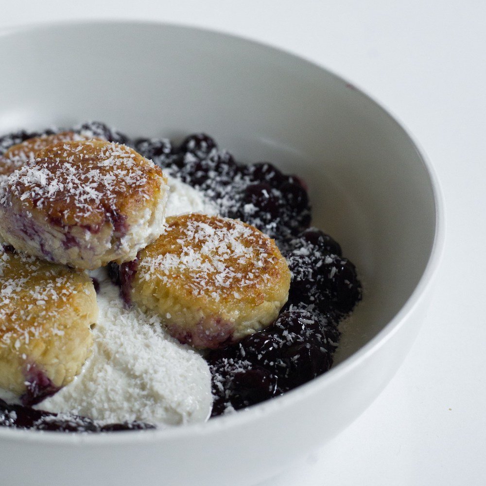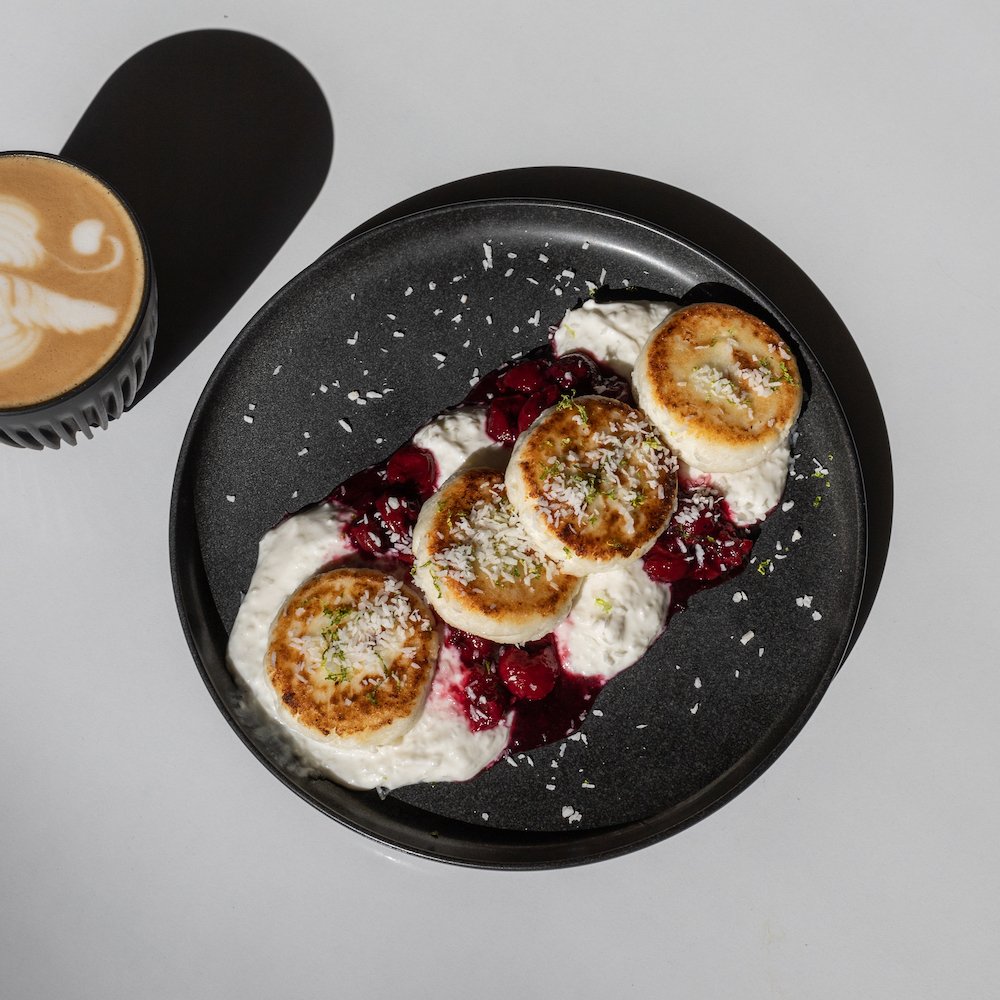 Cottage cheese pancakes, cherry, coconut sour cream, coconut flakes, lime