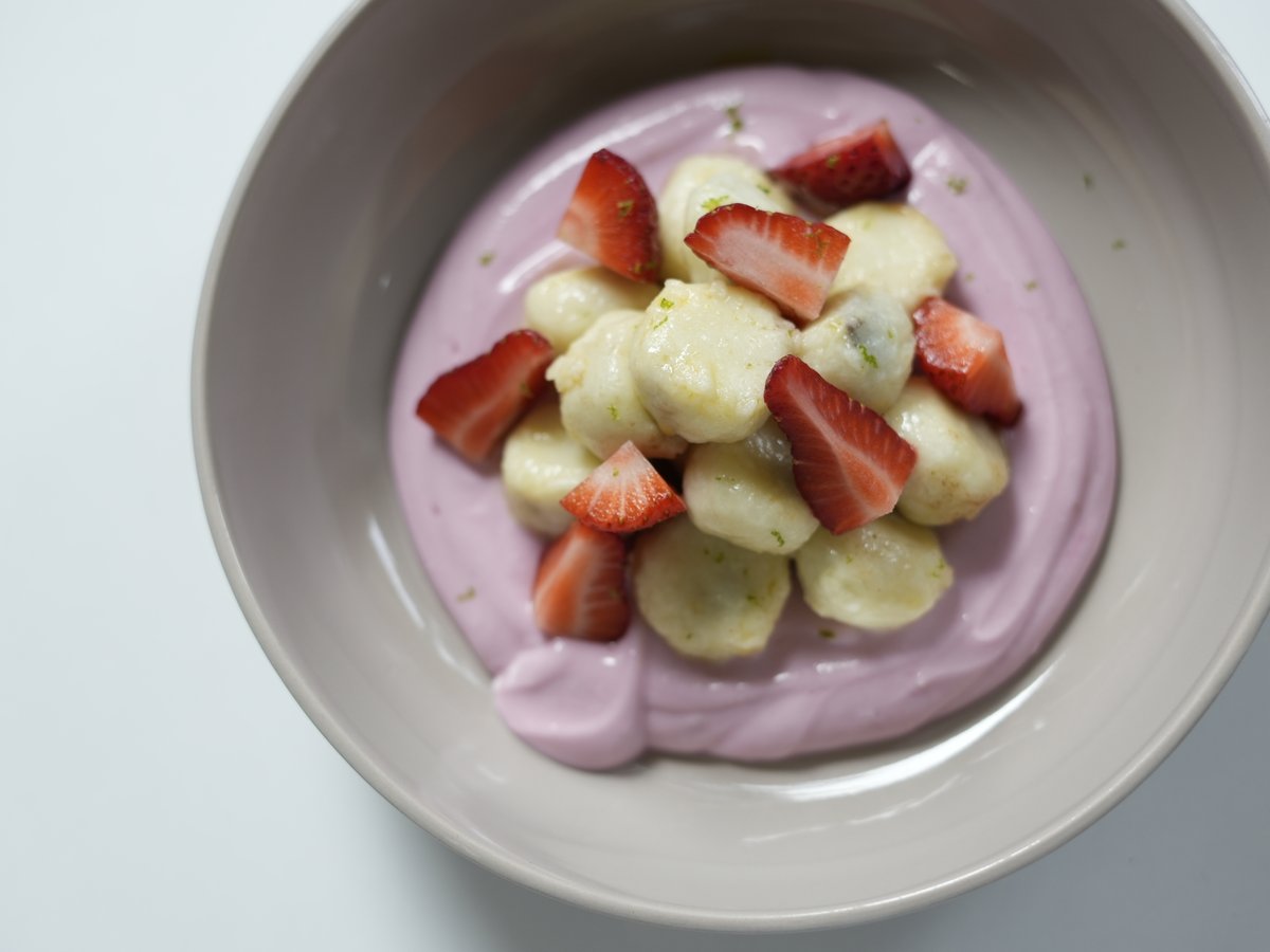 Cottage cheese balls with chocolate inside, cherry mousse, lemon zest, fresh berries