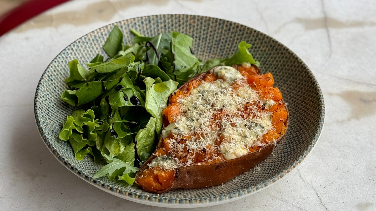 Baked sweet potato with gorgonzola cheese and truffle oil. Served with fresh salad and parmesan.