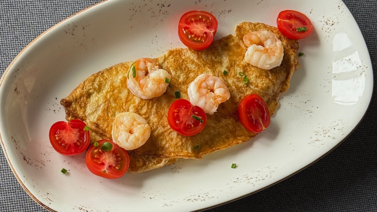 Fluffy omelet with juicy shrimp and cherry tomatoes