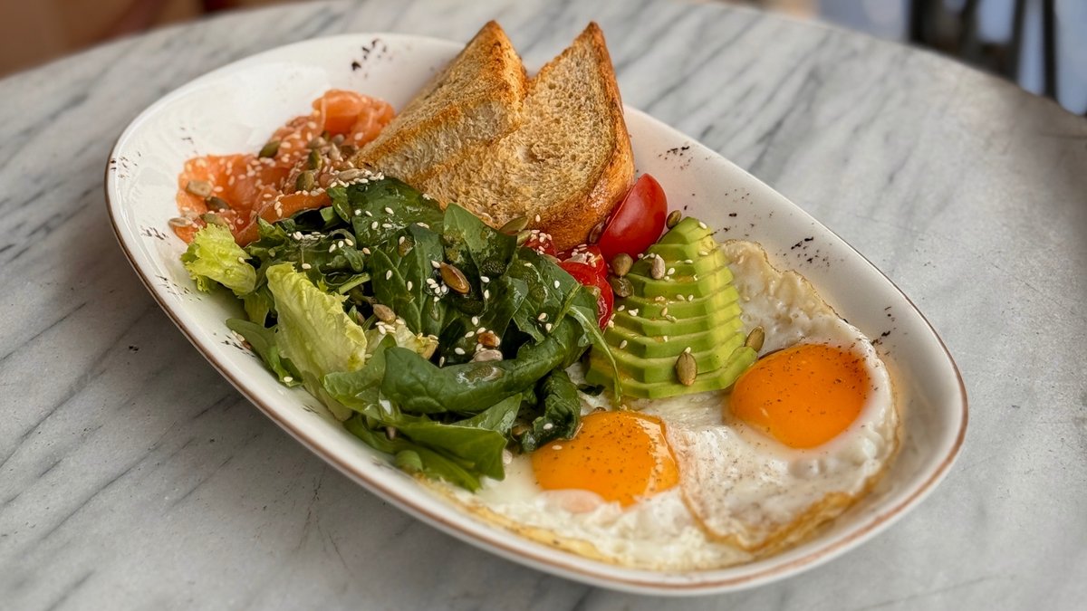 Eggs, lightly salted Norwegian salmon, mixed greens, cherry tomatoes, avocado, and whole-grain toasts