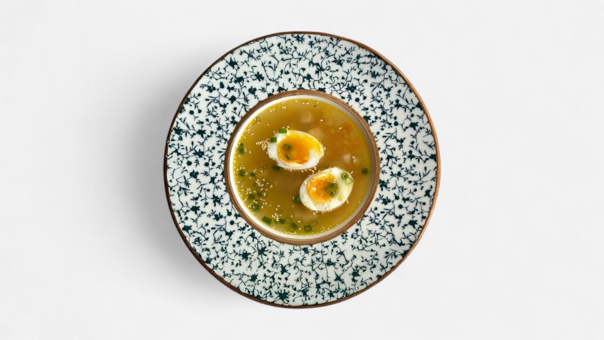 Chicken broth with the addition of smoked, dark soy sauce. Onion, carrot and celery paste, chicken fillet and orzo pasta.