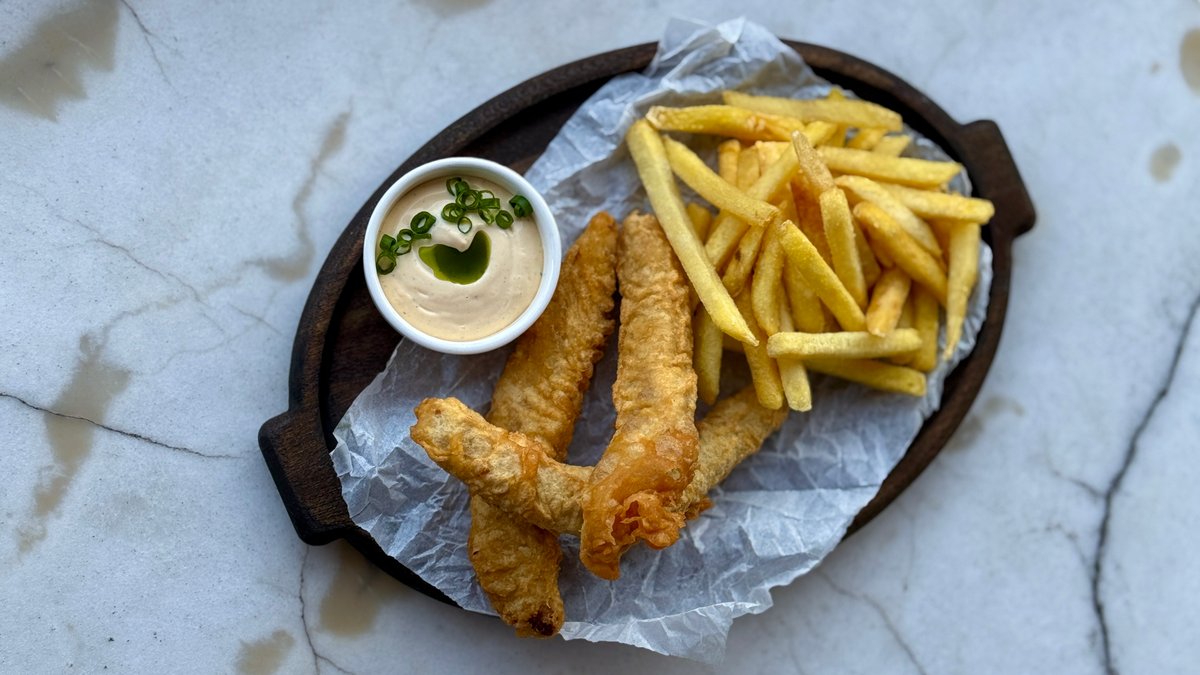 A classic dish: juicy battered fish fillet, served with fries and spicy sauce.