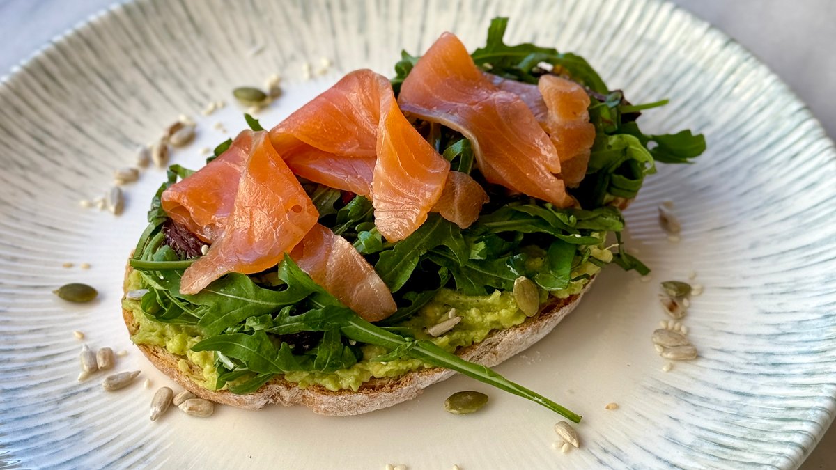 Guacamole (avocado, salt, pepper, lemon juice, olive oil), fresh greens, sun-dried tomatoes, and lightly salted Norwegian salmon on whole-grain toast.