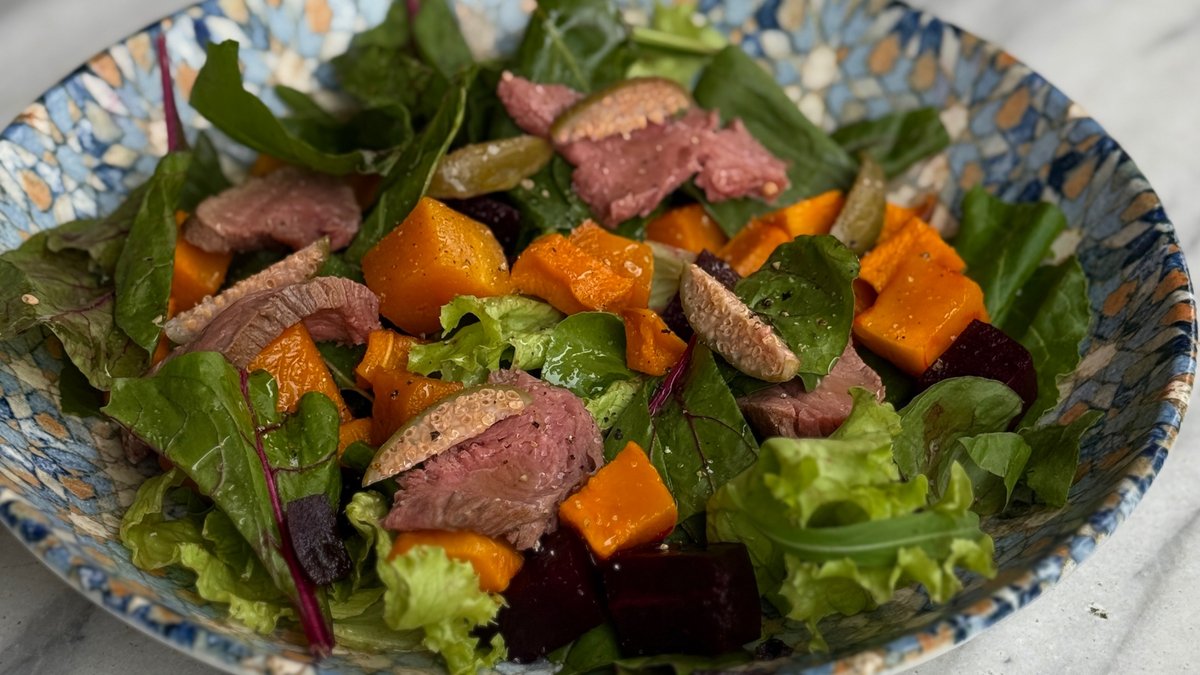 Mixed salad and roast beef dressed with sesame oil based sauce. Cherry tomatoes, red onions, pickled cucumbers and roasted potatoes. Topped with grated parmesan.