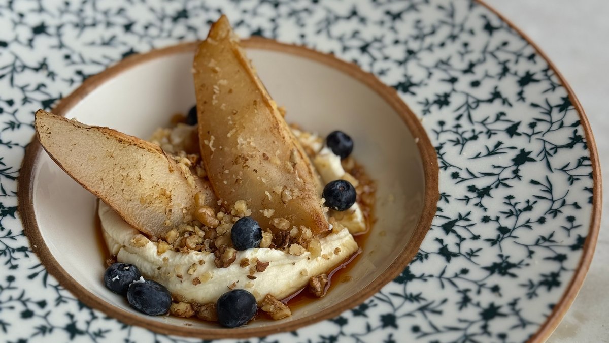 Baked pear, cinnamon, yogurt, white chocolate, maple syrup, nuts