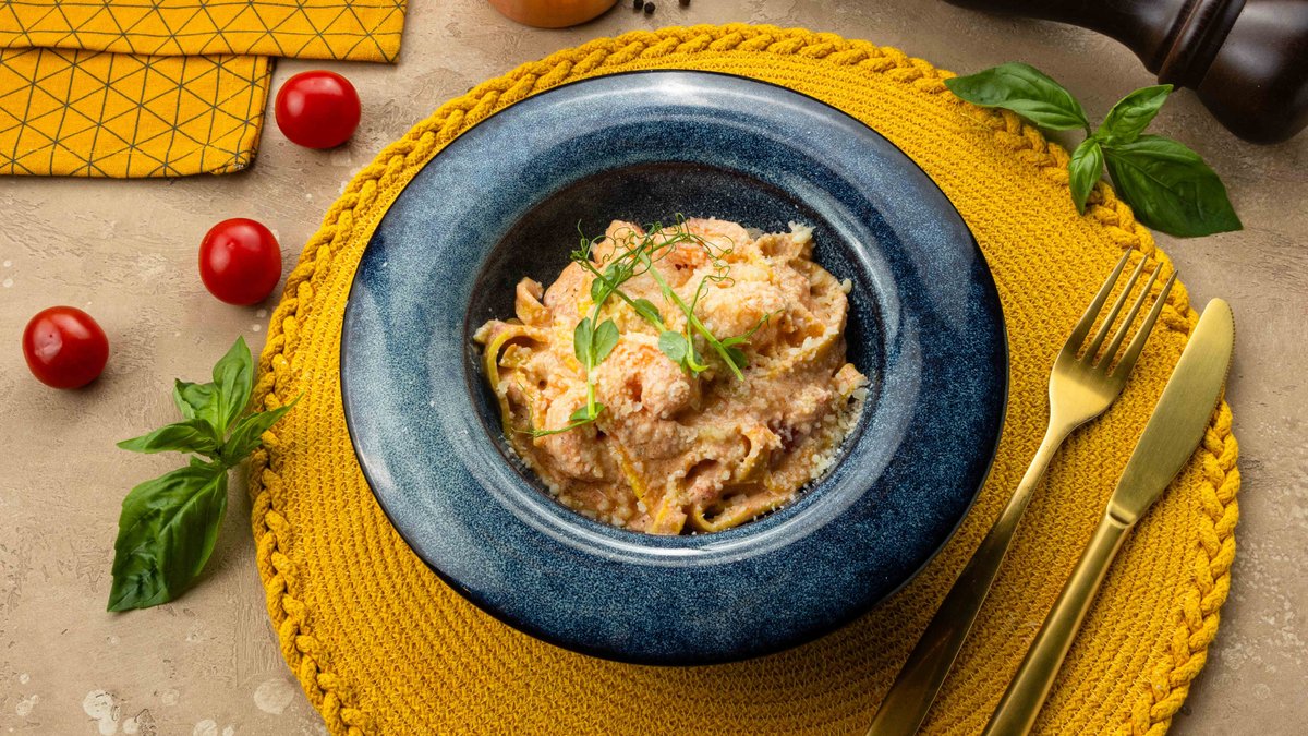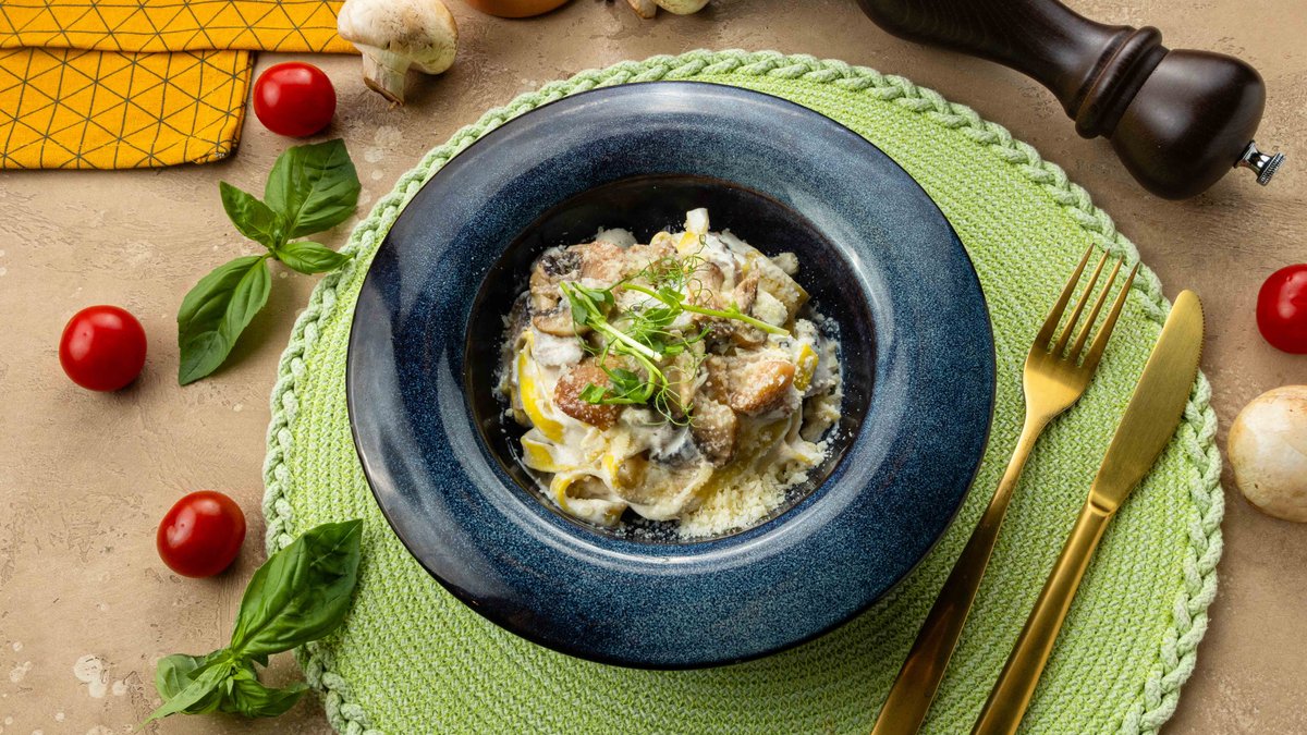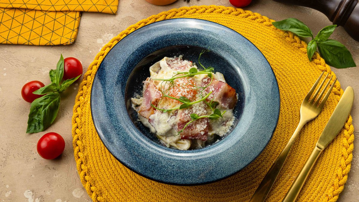 With bacon, cream sauce, egg yolk and parmesan cheese