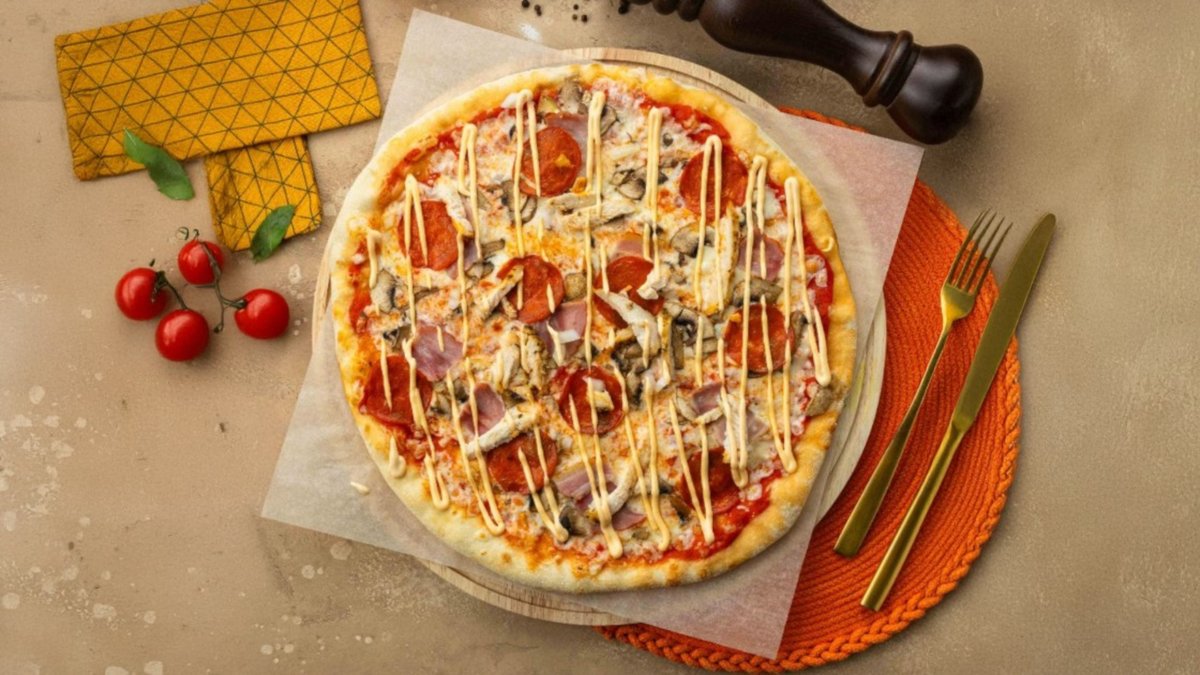 Pizza with bacon,pepperoni,chicken and mushrooms with special sauce picante