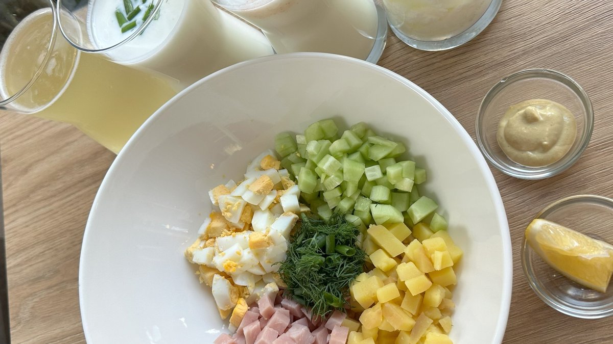 Craft kvass, potatoes, egg, ham, cucumber, sour cream, mustard, lemon