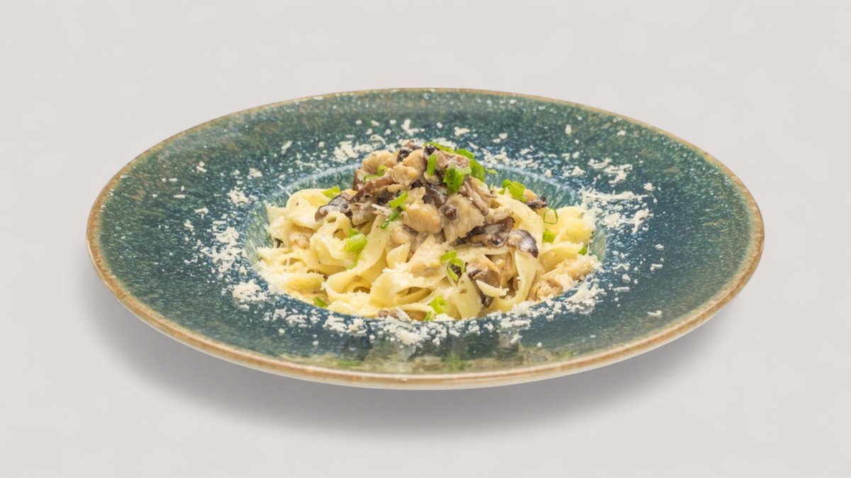 პასტა "ტალიატელე" ქათამი, სოკო, ყველი პარმეზანი, ნაღების სოუსი, ხახვი, ნიორი