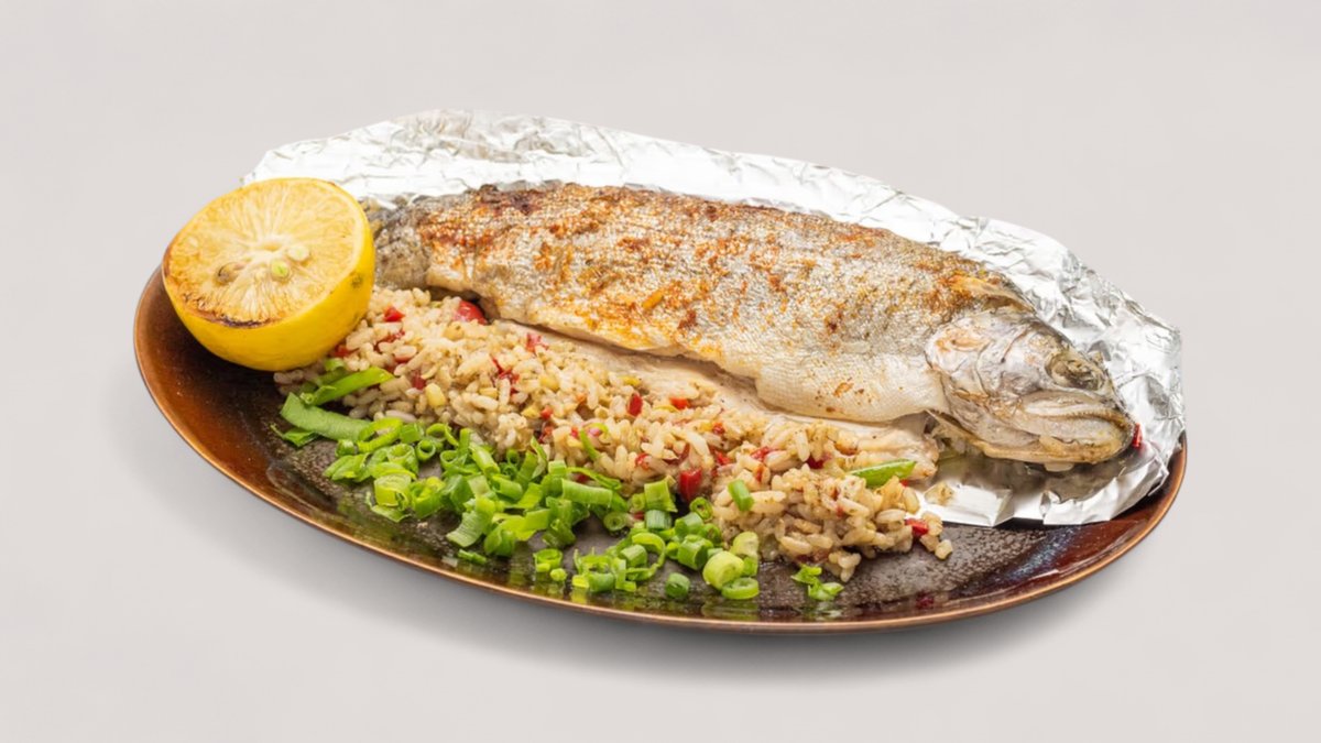 გამომცხვარი კალმახი ბრინჯით და ბოსტნეულით