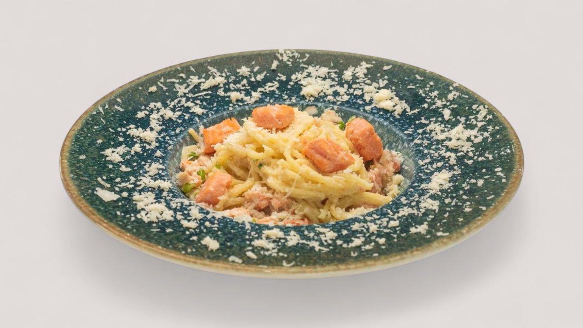სპაგეტი, ნაღების სოუსით, ნივრით, ხახვით, შავი ზღვის ორაგული და ყველი პარმეზანი