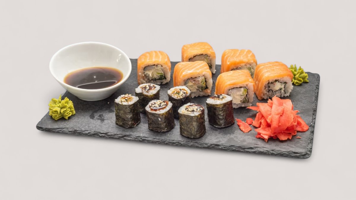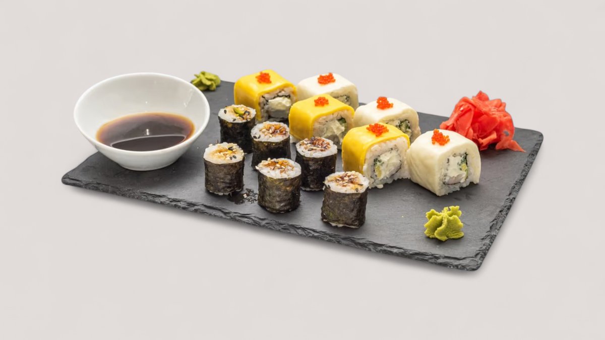 ბრინჯი, ავოკადო, კიტრი, კრემ ყველი, კრევეტები, ორაგული, ჯინჯერი, ვასაბი, ნორი, სოიოს სოუსი