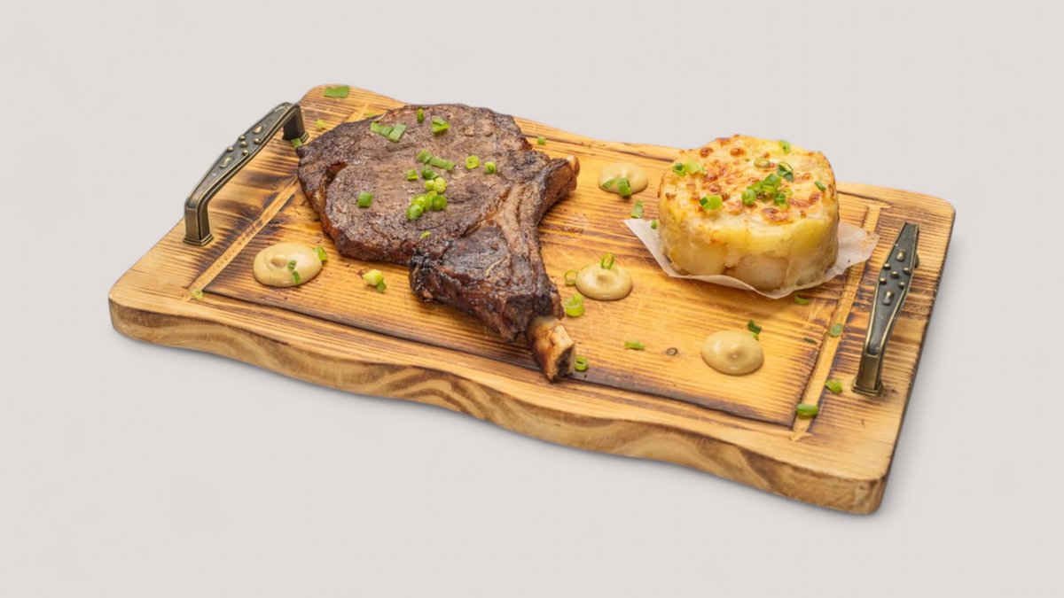 რიბაი სტეიკი გამომცხვარი კარტოფილის გარნირით