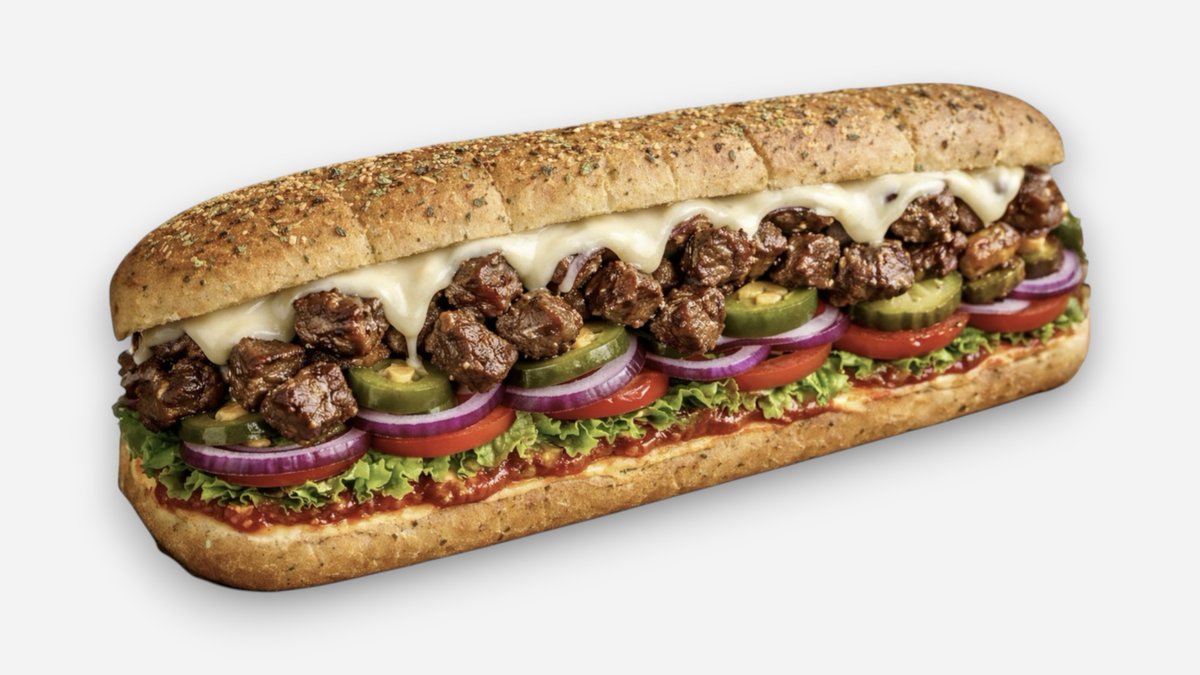 Grilled beef, Georgian adjika, cheddar cheese, cheese sauce, vegetables, sauces, sandwich bread