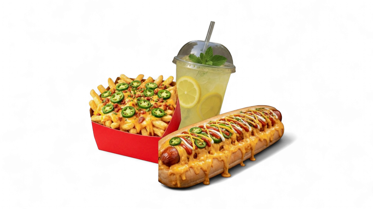 XL cheddar cheesy jalapeño hotdog + large cheesy jalapeño fries + lemonade