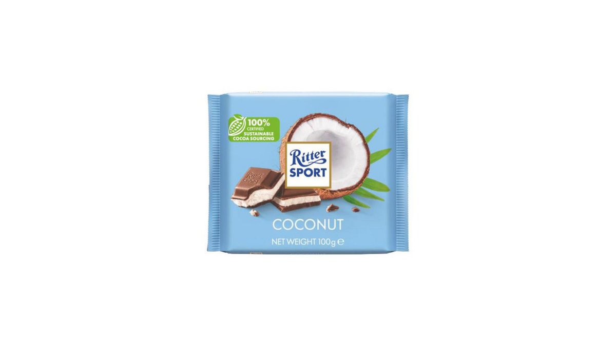 "Ritter sport"- რძიანი შოკოლადი მთლიანი ნუშით და ქოქოსის შიგთავსით 12*100 გ/4000417298003