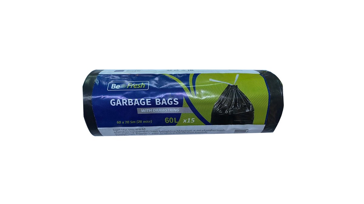 ბიფრეშ ნაგვის პარკი თასმით, შავი 15 ცალი (60x70სმ 60 ლიტრი)