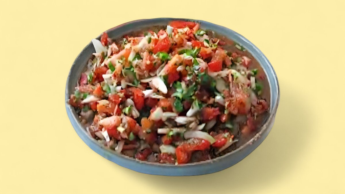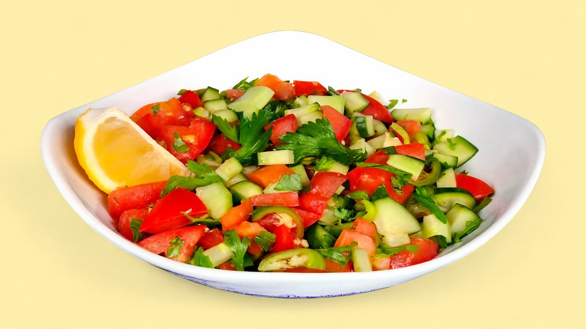 tomato, red onion, green pepper, cucumber, parsley