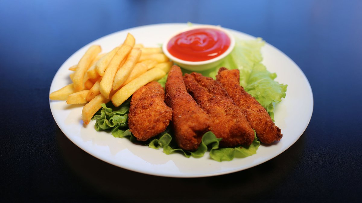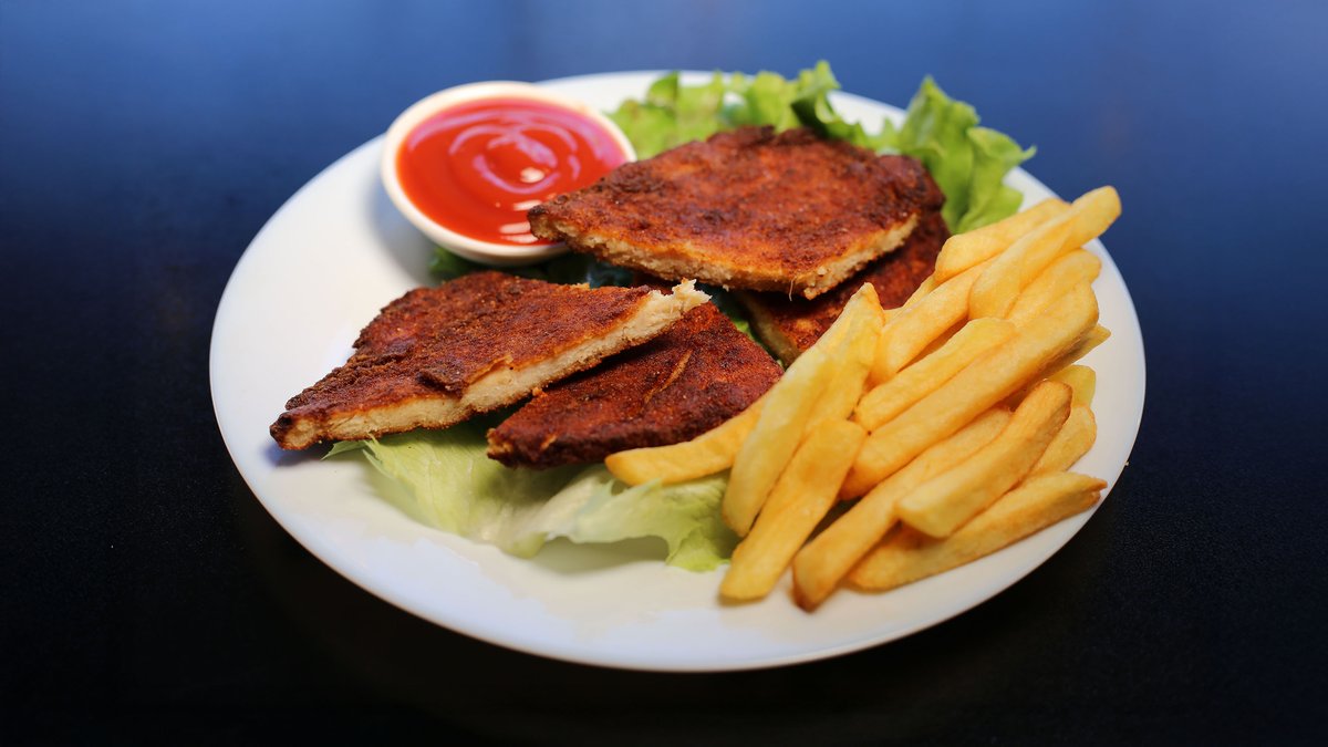 ქათმის ფილე ფრის გარნირით კეჩუპთან ერთად