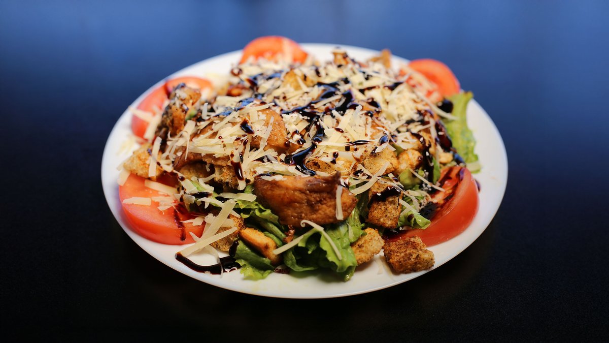 სალათის ფოთოლი, ცეზარის დრესინგი, ქათმის ფილე, სუხარიკები, პარმეზანი, პომიდორი.