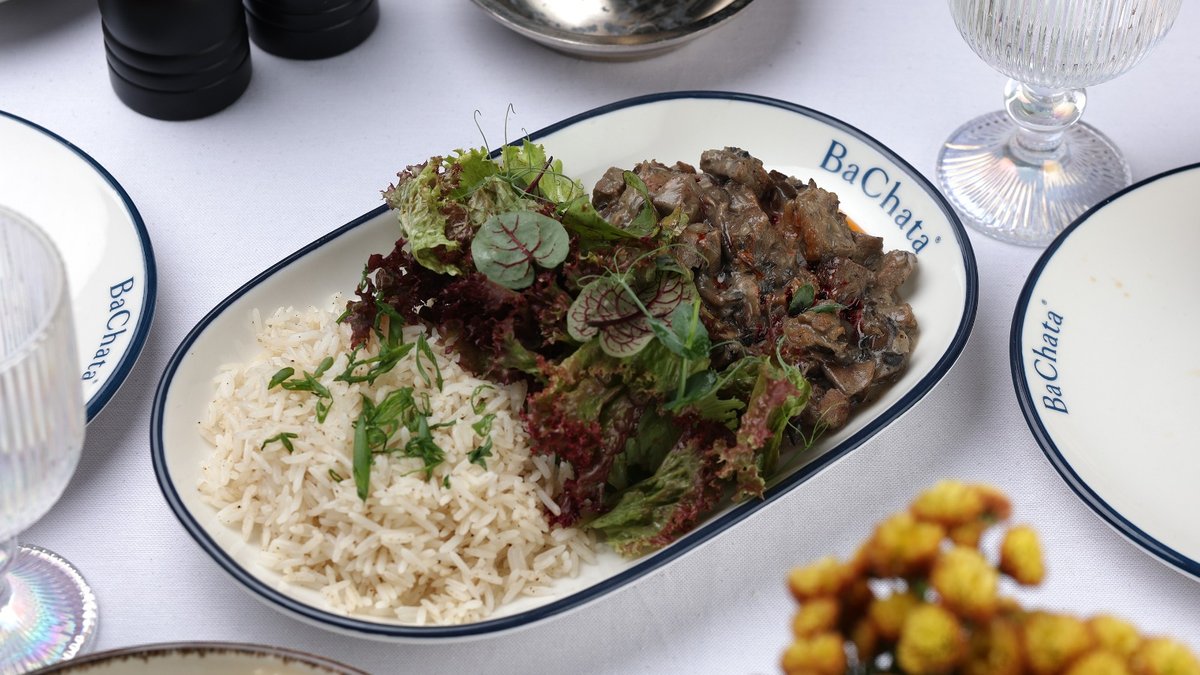 Beef, sour cream, cream, champignon mushrooms, basmati rice, bonito flakes, lemongrass, salad mix