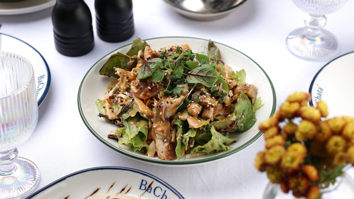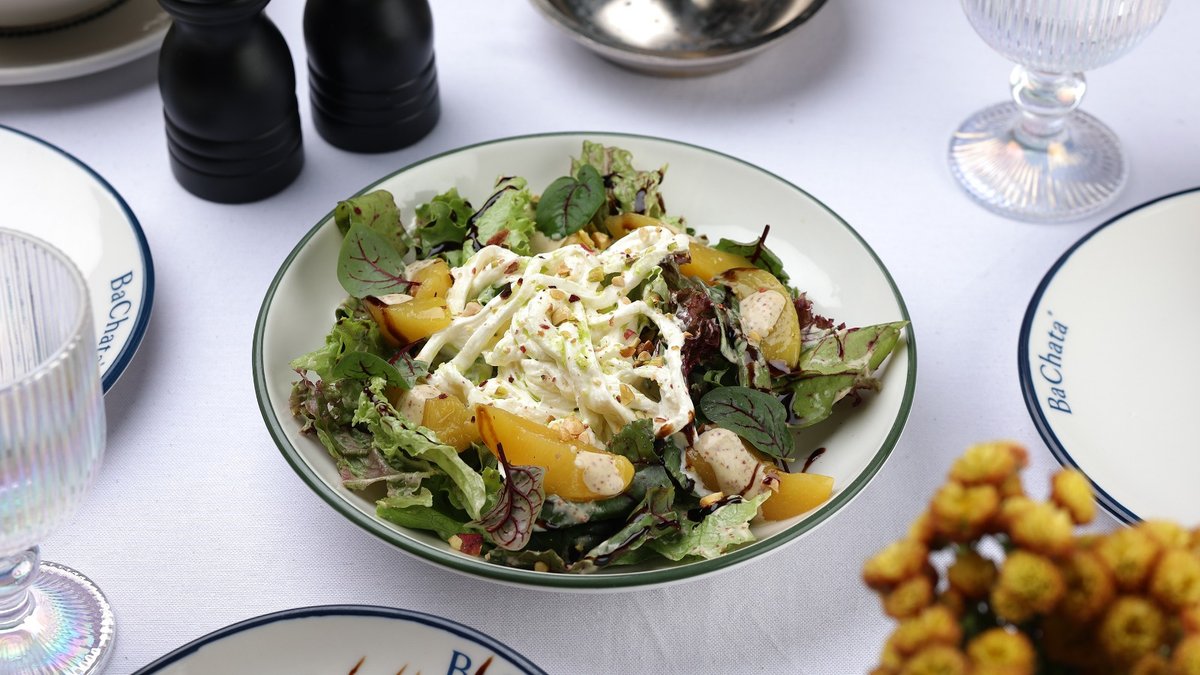 Salad mix, peaches, stracciatella cheese, pistachios, basil, mustard sauce