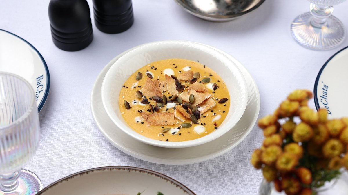 Baked pumpkin, cream, lemon, butter, tortilla chips, roasted pumpkin seeds, black sesame