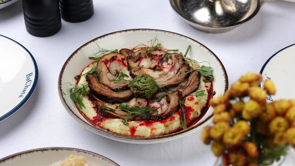 Pork, wasabi and potato puree, pesto made from pork roll broth