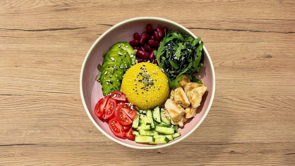 Avocado, Chicken, Couscous, Cherry Tomato, Cucumber, Beans, Honey Sauce, Peanuts, Arugula
