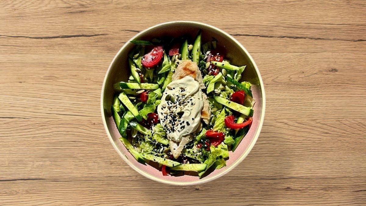 Lettuce, Arugula, Iceberg, Cherry Tomatoes, Cucumbers, Seed And Sesame Mix, Olive Oil, Grilled Chicken, Cream Cheese And Garlic Mayonnaise Sauce