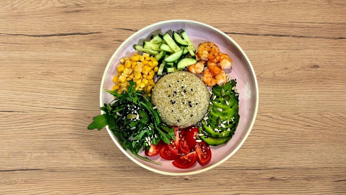 Quinoa, Avocado, Arugula, Shrimp, Cucumbers, Cherry Tomatoes, Corn, Balsamic Sauce, Seed And Sesame Mix