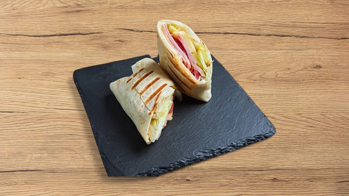 tortilla, cream cheese, iceberg, tomato, gauda cheese, turkey ham
