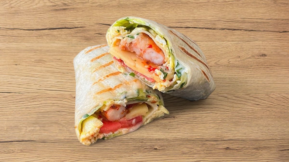 tortilla, shrimp, iceberg, gauda cheese, garlic sauce, tomato, egg, sweet and sour sauce