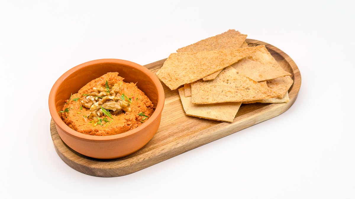 ROASTED SWEET CHILI & WALNUT PASTE. SERVED WITH BAKED PITA CHIPS