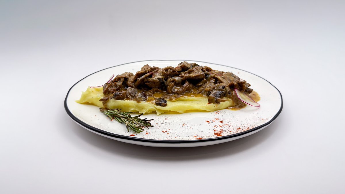 Tender beef strips with mushrooms in a rich creamy sauce, served with mashed potatoes or rice