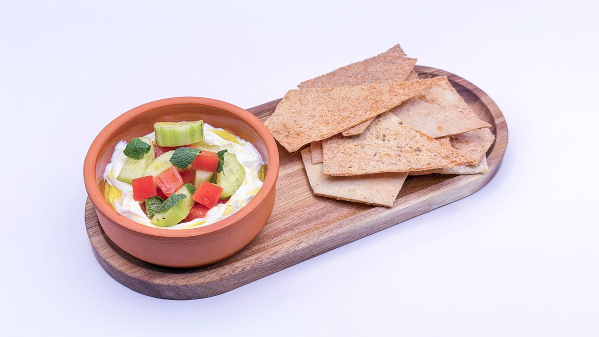 Our special labneh mix, topped with a cucumber, tomato, and mint salad, dressed with lemon oil. Served with baked pita chips