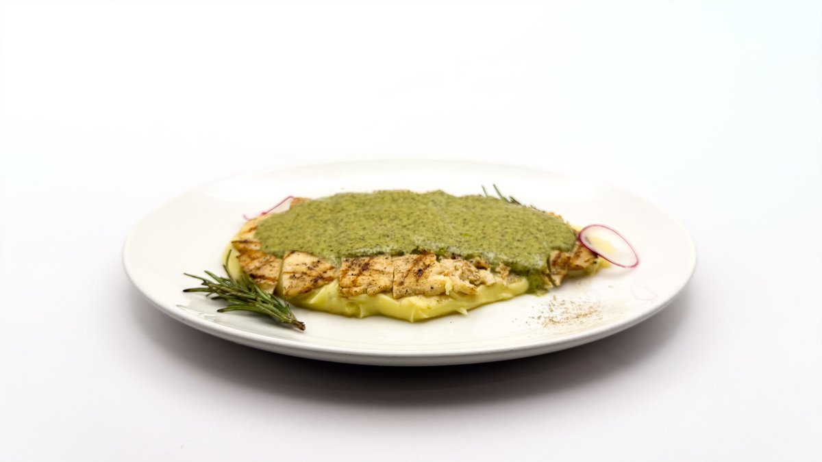 Char-grilled chicken breast served with basil pesto cream and mashed potatoes
