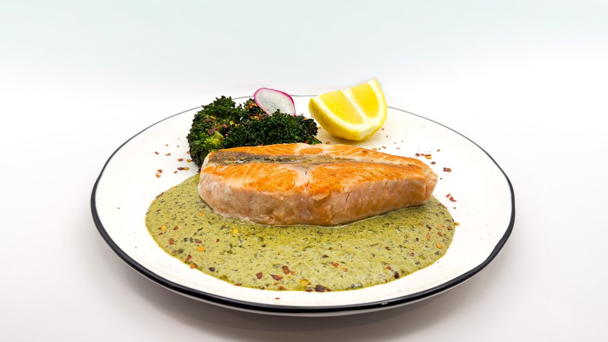 Pan-seared salmon with basil pesto cream and charred broccoli