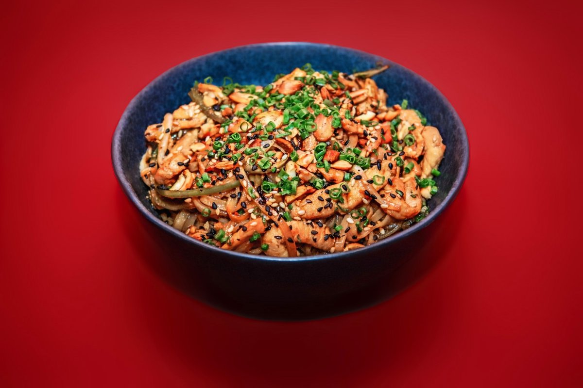 ქათმის ხორცი, ნუდლსი, კომბოსტო, სტაფილო, სოუსი