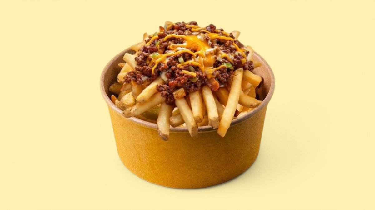 French fries, 120g beef meat, tomatoes, onions, melted cheese, salt