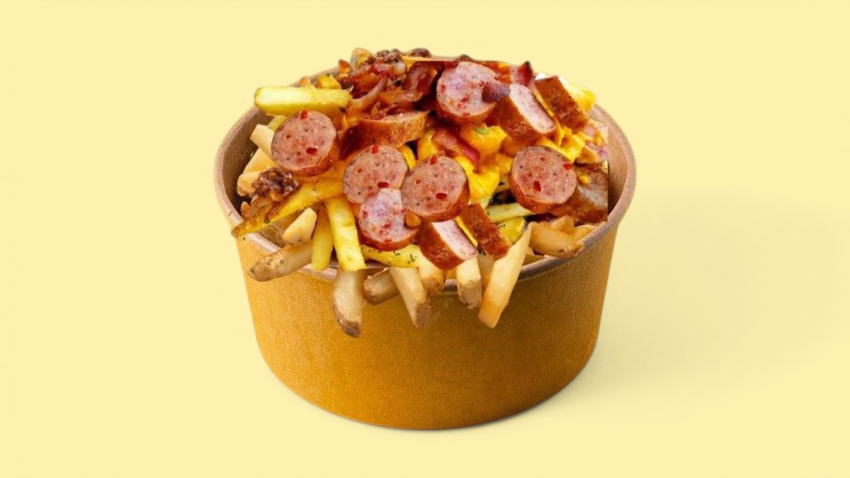 French fries, melted cheddar cheese, sliced hot dog