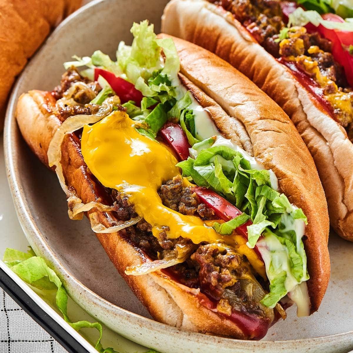 1 Beef Hot Dog, lettuce, grilled ground beef, cheddar cheese , pickles, and mustard sauce.