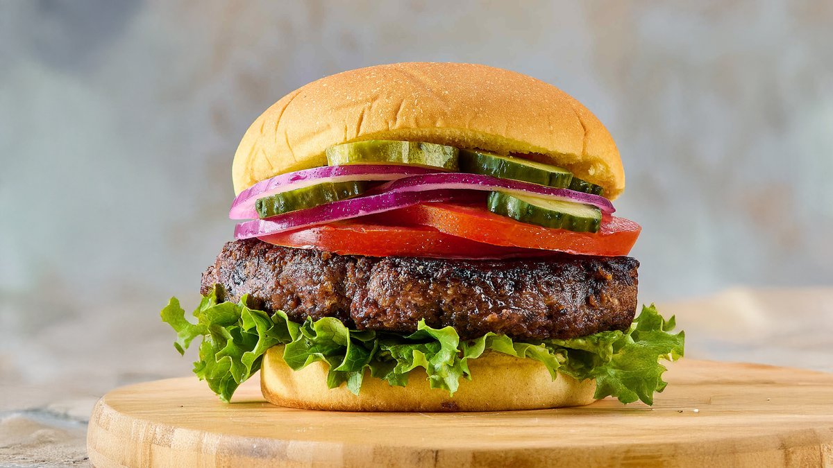 vegan patty, vegan cheese, lettuce, tomato, onions, pickles, and vegan burger sauce.