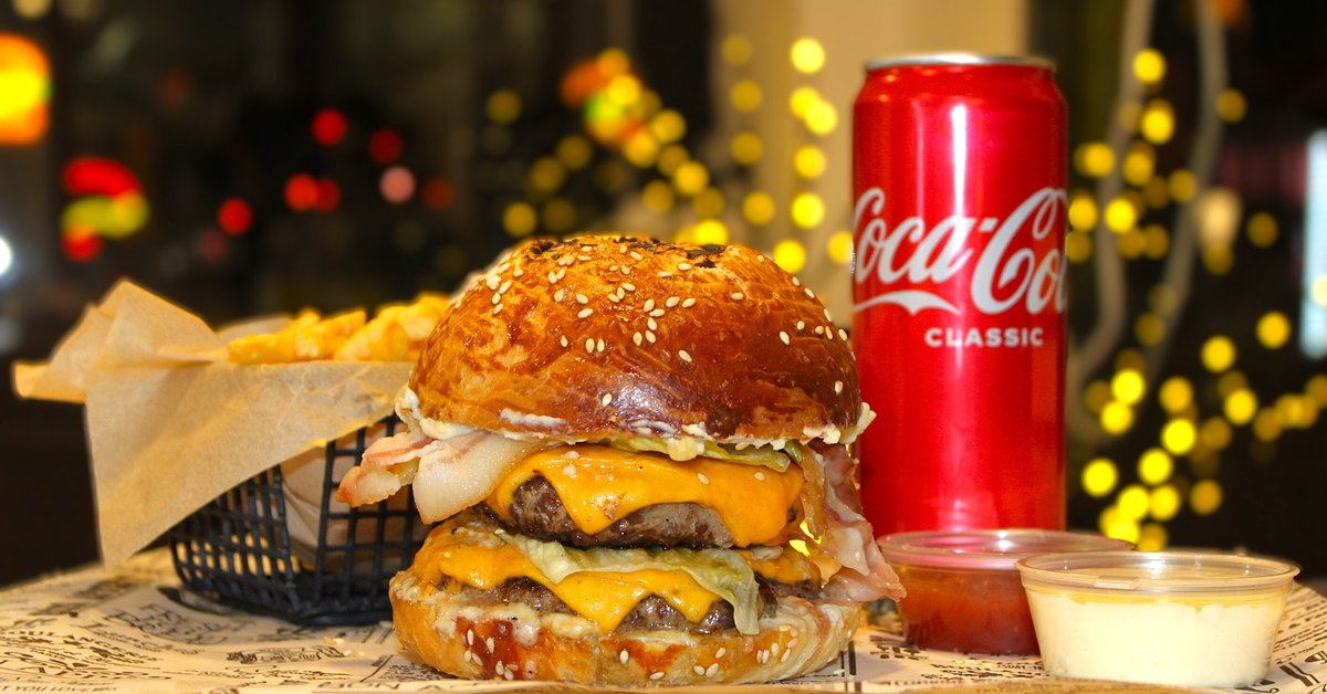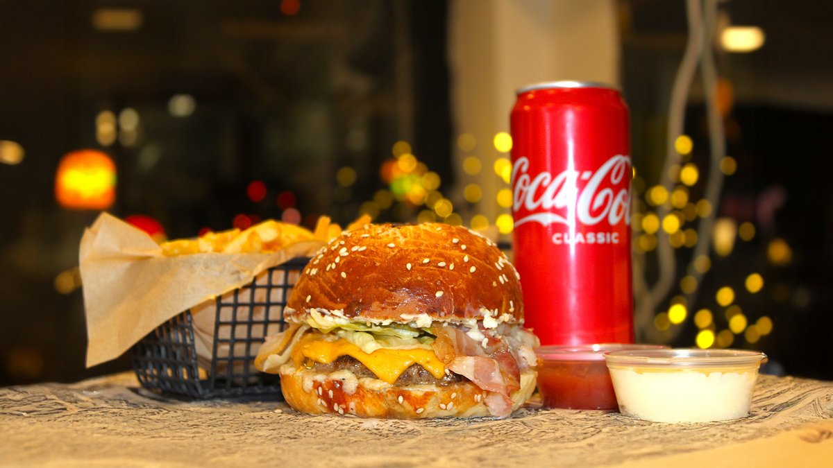 ფუნთუშა, ორმაგი წვნიანი ხორცი, ჩედარის ფირფიტები, პომიდორი, მჟავე კიტრი, აისბერგი, კლასიკური სოუსი + ფრი და კოკა-კოლა