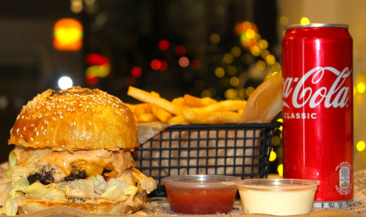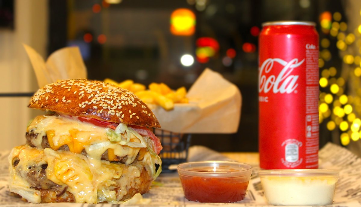 ფუნთუშა, საუკეთესო წვნიანი ხორცი, ორმაგი ჩედარის ფირფიტა, მჟავე კიტრი, რუკოლა, მობრაწული კარაქი + ფრი და კოკა-კოლა
