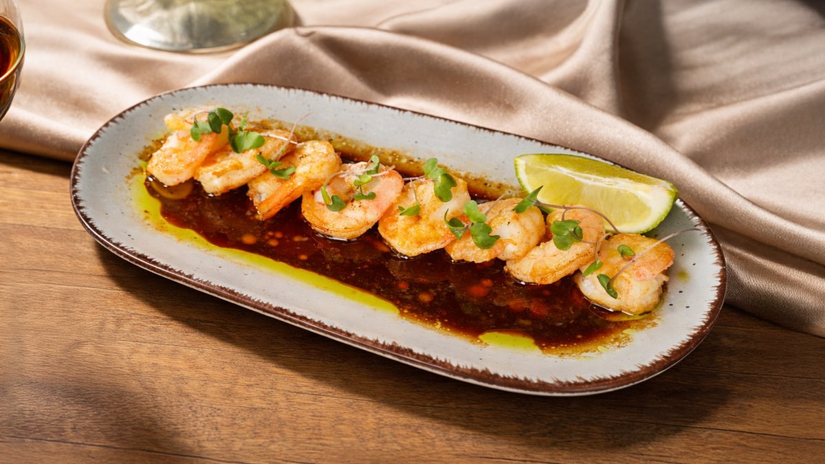 არომატულ ნიორის ზეთში შემწვარი წვნიანი კრევეტები, სერვირებული ფირმის სოუსითა და მწვანე ზეთით. ზღვის პროდუქტების არომატის ხაზგასასმელად მოყვება ახალი ლაიმი.