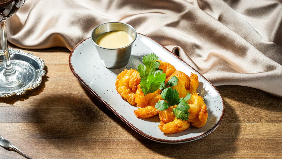 ხრაშუნა ტემპურის კრევეტები თაფლ-მდოგვის სოუსით