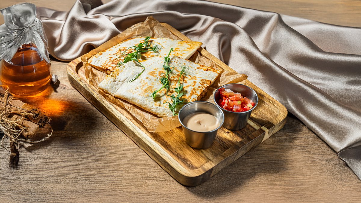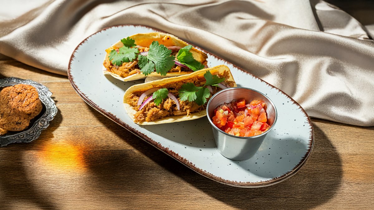 ტაკო დახეული ღორის ხორცით, ყველით, ახალი ბოსტნეულით და ქინძით