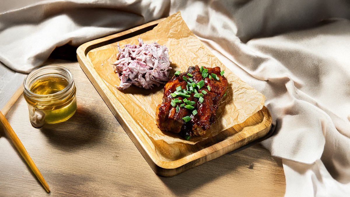 ნაზი, ნელა მომზადებული ღორის ნეკნები ბარბექიუს სოუსით და კოულსლოს სალათით, მწვანე ხახვით და მიკრო-მწვანილით.